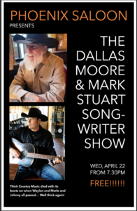 Hey Huck an’ Buck…y’all listenin’!? Think Country Music died with its boots on!? Well not quite. This promises to be a great night as lauded and applauded Outlaw Country great Dallas Moore teams up with good bud Mark Stuart from Bastard Sons Of Johnny Cash for an intimate acoustic show that variously wrangles and tangles the twisted roots of Americana. Songs of grit and graft and drift and dirt and blood and bone and hurt and holler delivered with pith,…